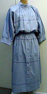 About MuseumFinland![]() | Materiaali: puuvillapalttina Valmistaja: Vuokko Oy Valmistuspaikka: Suomi Valmistusaika: 1980-l.ap Käyttäjä: Marjatta Havukainen Käyttöpaikka: Helsinki, Uudenmaan lääni, Uusimaa, Suomi Asiasana: NAISEN VAATTEET Mitat: koko M, pituus 122cm Museokokoelma: LAHDEN HISTORIALLINEN MUSEO Vastuumuseo: LAHDEN KAUPUNGINMUSEO Asiasanasto: Lahden kaupunginmuseon sanasto Esineen numero: LKM:LHM:LHM:ES:2001016:3 ID: 20010163 Vyötärösaumaton puuvillapuku, jossa puolipitkät kimonohihat. hihojen suut on poimutettu leveään kaitaleeseen. Malliltaan suora, edestä auki kiinnittiminä painonapit. Pystykaulus ja molemmin puolin päälitaskut. Esinetyyppi:
