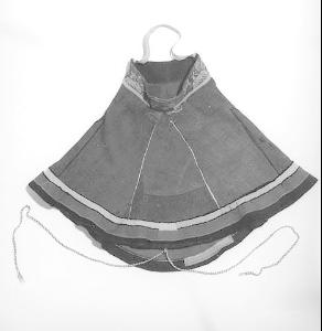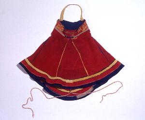 About MuseumFinland![]() ![]() | Materiaali: kangas;villa Valmistustekniikka: käsityö Asiasana: asusteet, lukat, saamelaiset, suomalais-ugrilaiset kansat Mitat: korkeus:46cm, korkeus:63cm, ympärysmitta:106cm, ympärysmitta:62cm Museokokoelma: Suomalais-ugrilaiset kokoelmat Vastuumuseo: Suomen kansallismuseo Asiasanasto: Museoalan asiasanasto Esineen numero: NBA:SU4135:49 ID: 11085 Punaisesta villakankaasta ommeltu hartiasuojus. Suojus on leikattu yhdestä suorakaiteen muotoisesta kappaleesta. Kappaleen toiselle pitkälle sivulle on leikattu säännöllisin välein kolme halkiota, jotka ulottuvat lähelle vastakkaista pitkää sivua. Kappaleen päät on ommeltu yhteen. Halkioihin on ommeltu kolmiomaiset, alaspäin levenevät kiilat, jotka antavat hartiasuojukselle sen voimakkaasti alaspäin levenevän muodon. Halkioiden reunoissa on siniset tai keltaiset verkatereet. Pääntiellä on 5,5 cm korkea, tasakorkuinen kaulus ostopuuvilladamastia. Kauluskappaleeseen on ommeltu 38 cm:n pituinen puuvillainen ostonauha, joka pään päälle asetettuna kannattelee hartiasuojusta. Helmaa kiertää kapea helmakappale, joka on koristeltu mm. sinisin terein sekä niiden väliin ommellulla keltaisella verkakaitaleella. Hartiasuojuksen etupuolen nurjalle puolelle on kiinnitetty kahdet raksit, joiden kautta taakse keskelle nurjalle puolelle kiinnitetyt punotut villanyörit (pituus 74 cm) solmitaan suojusta kiinnitettäessä. Esinetyyppi: